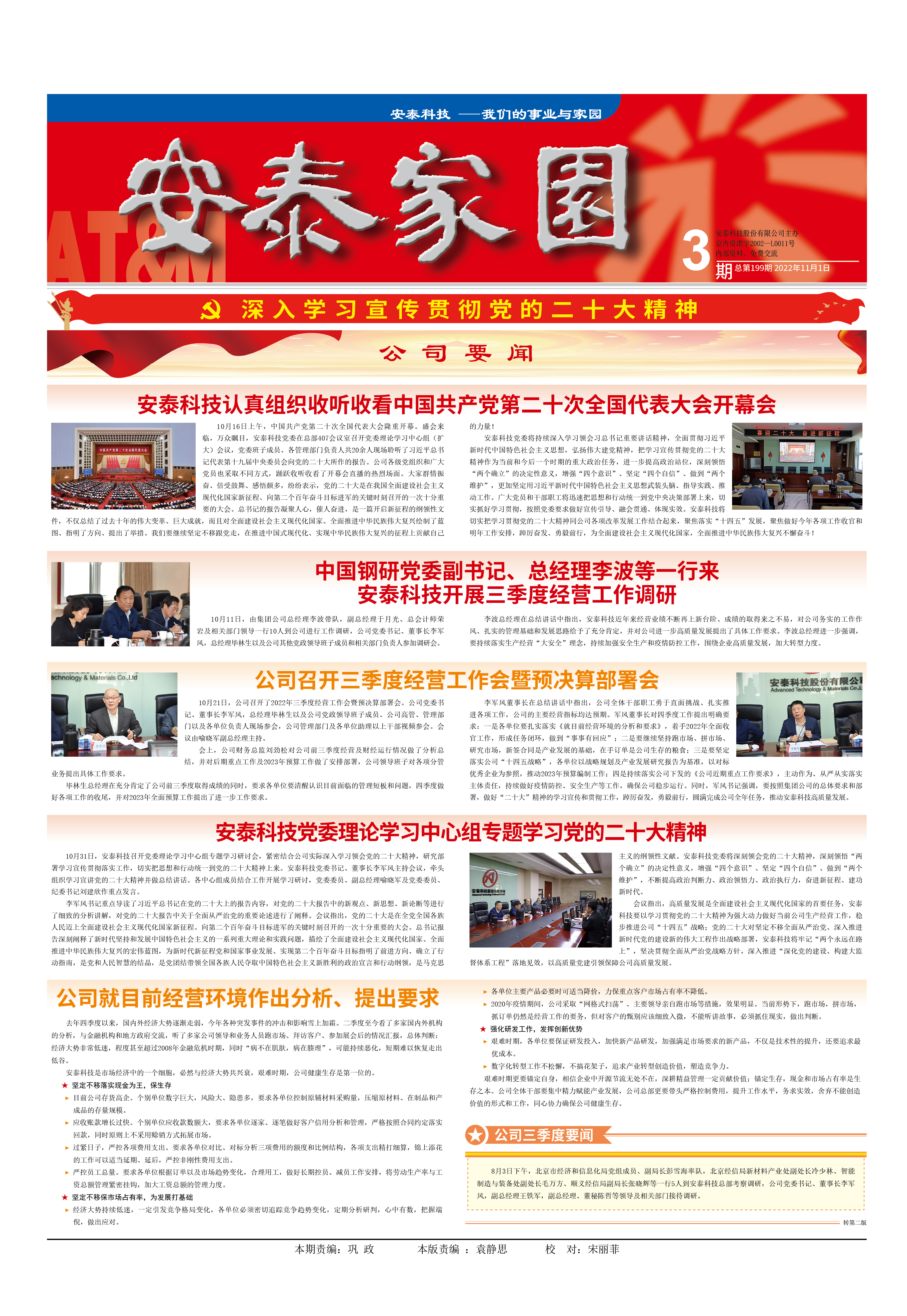 安泰科技黨委將持續(xù)深入學(xué)習(xí)領(lǐng)會習(xí)總書記重要講話精神,全面貫徹習(xí)近平新時代中國特色社會主義思想,弘揚偉大建黨精神,把學(xué)習(xí)宣傳貫徹黨的二十大精神作為當(dāng)前和今后一個時期的重大政治任務(wù),進一步提高政治站位,深刻領(lǐng)悟“兩個確立”的決定性意義,增強“四個意識”、堅定“四個自信”、做到“兩個維護”,更加堅定用習(xí)近平新時代中國特色社會主義思想武裝頭腦、指導(dǎo)實踐、推動工作。廣大黨員和干部職工將迅速把思想和行動統(tǒng)一到黨中央決策部署上來,切實抓好學(xué)習(xí)貫徹,按照黨委要求做好宣傳引導(dǎo)、融會貫通、體現(xiàn)實效。安泰科技將切實把學(xué)習(xí)貫徹黨的二十大精神同公司各項改革發(fā)展工作結(jié)合起來,聚焦落實“十四五”發(fā)展,聚焦做好今年各項工作收官和明年工作安排,踔厲奮發(fā)、勇毅前行,為全面建設(shè)社會主義現(xiàn)代化國家,全面推進中華民族偉大復(fù)興不懈奮斗!