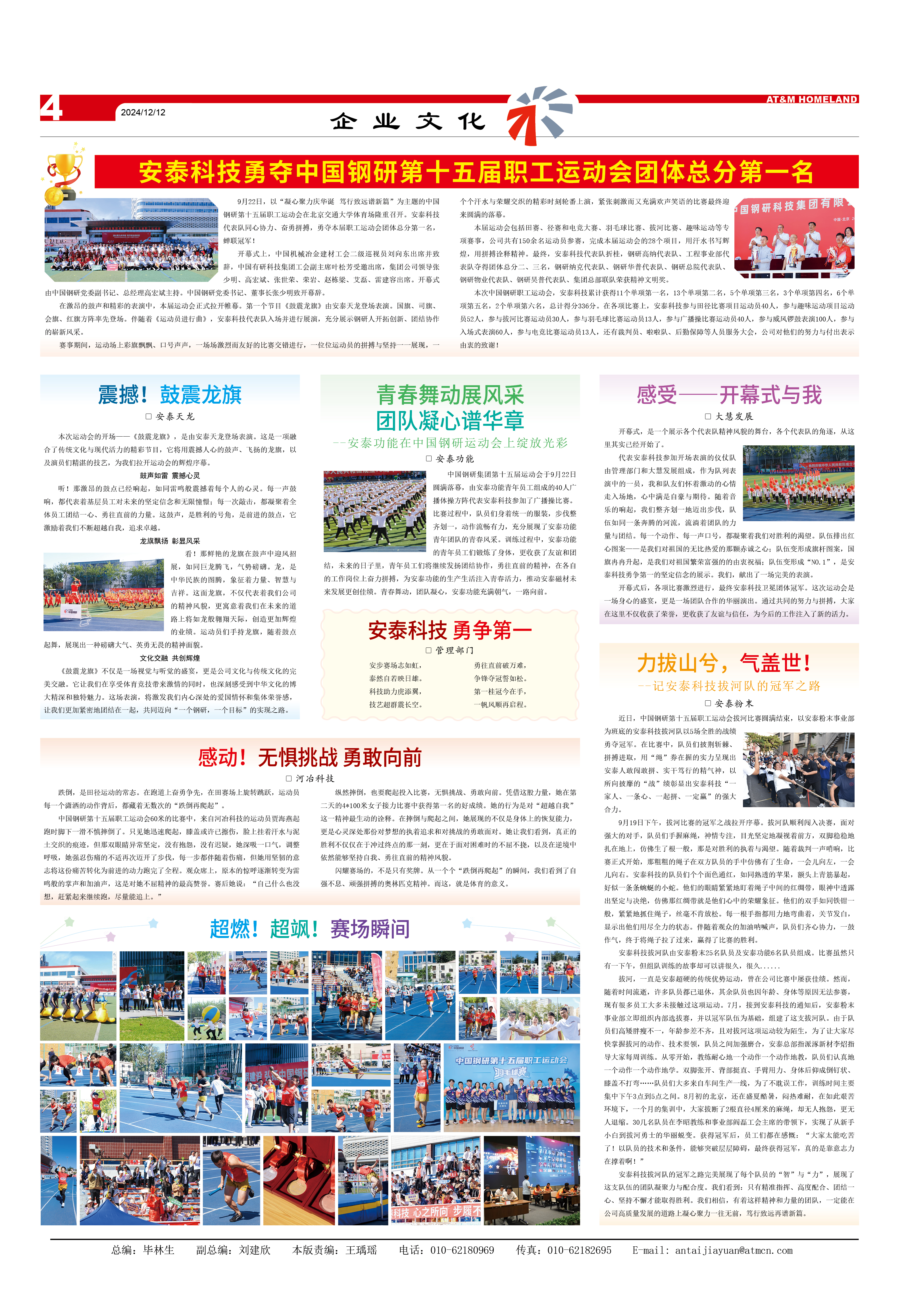 本次中國(guó)鋼研職工運(yùn)動(dòng)會(huì),安泰科技累計(jì)獲得11個(gè)單項(xiàng)第一名,13個(gè)單項(xiàng)第二名,5個(gè)單項(xiàng)第三名,3個(gè)單項(xiàng)第四名,6個(gè)單項(xiàng)第五名,2個(gè)單項(xiàng)第六名,總計(jì)得分336分。在各項(xiàng)比賽上,安泰科技參與田徑比賽項(xiàng)目運(yùn)動(dòng)員40人,參與趣味運(yùn)動(dòng)項(xiàng)目運(yùn)動(dòng)員52人,參與拔河比賽運(yùn)動(dòng)員30人,參與羽毛球比賽運(yùn)動(dòng)員13人,參與廣播操比賽運(yùn)動(dòng)員40人,參與威風(fēng)鑼鼓表演100人,參與入場(chǎng)式表演60人,參與電競(jìng)比賽運(yùn)動(dòng)員13人,還有裁判員、啦啦隊(duì)、后勤保障等人員服務(wù)大會(huì),公司對(duì)他們的努力與付出表示由衷的致謝!